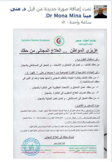واختتم المنشور، بتعريف المواطن بحقه في العلاج دستوريًا، وفقًا للمادة 18 والتي تنص على: “لكل مواطن الحق في الصحة وفي الرعاية الصحية المتكاملة وفقًا لمعايير الجودة، وتكفل الدولة الحفاظ على مرافق الخدمات الصحية العامة التي تقدم خدماتها للشعب ودعمها والعمل على رفع كفاءتها وانتشارها الجغرافي”.