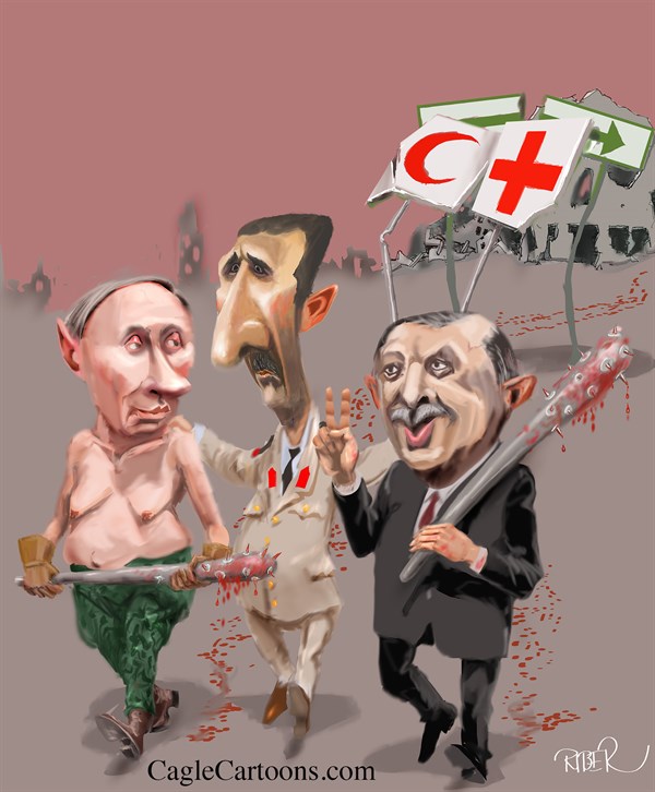 وعن مجازر بشار وبوتين وأردوغان في سوريا نشر موقع “بولتيكال كارتونز” هذا الرسم: