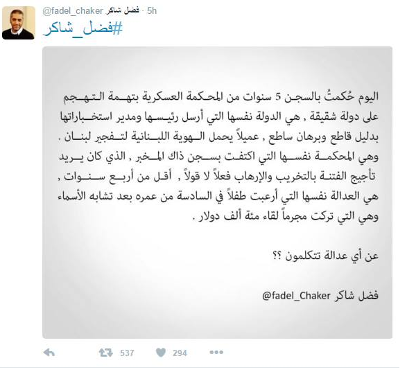 وكتب في تغريدة له عبر حسابه الشخصي على موقع التغريدات المصغرة “تويتر”: “اليوم حُكمت بالسجن خمس سنوات من المحكمة العسكرية بتهمة التهجم على دولة شقيقة، وهي الدولة نفسها التي أرسل رئيسها ومدير مخابراتها بدليل قاطع عميلا يحمل الهوية اللبنانية لتفجير لبنان”.