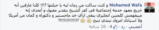 وأثار الأمر ردود فعل كبيرة على موقع التواصل الاجتماعي “فيس بوك”؛ حيث قال “محمد وفا”: “وكنت ساكت من زمان ليه يا حيلتها!!!؟ كلنا عارفين إنه خريج معهد خدمة اجتماعية في كفر الشيخ بتقدير مقبول وأتحدى إنه مبيفهمش كلمتين إنجليزي يبقى ازاي خد ماجستير ودكتوراه وكمان من أميركا ولا أسيادك أمروك تبتدي تنبح”.