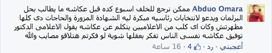 “عبده عمارة”: “ممكن نرجع للخلف أسبوع كده قبل عكاشة ما يطالب بحل البرلمان ويدعو لانتخابات رئاسية مبكرة ليه الشهادة المزورة والحاجات دي كلها مظهرتش وكان أي كلب من الإعلاميين يتكلم عن عكاشة يقول الإعلامي الدكتور توفيق عكاشة نفسي الناس تفكر بعقلها شوية لو فكرتم هتلاقوا مصايب والله”.
