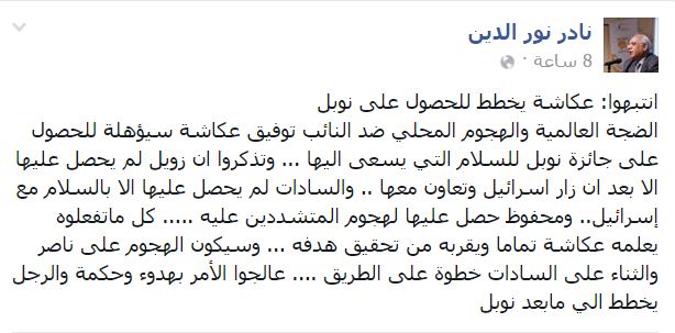 وأضاف -في منشور له على “فيس بوك”- “وتذكروا أن زويل لم يحصل عليها إلا بعد أن زار إسرائيل وتعاون معها، والسادات لم يحصل عليها إلا بالسلام مع إسرائيل.. ومحفوظ حصل عليها لهجوم المتشددين عليه”.