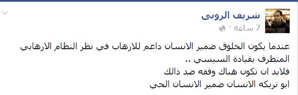 وقال -عبر منشور له على “فيس بوك”-: “عندما يكون الخلوق ضمير الإنسان داعم للإرهاب في نظر النظام الإرهابي المتطرف بقيادة السيسي ..فلا بد أن تكون هناك وقفة ضد ذلك، أبو تريكة الإنسان ضمير الإنسان الحي”.