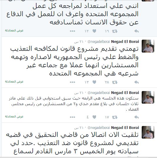 وأشار “البرعي” إلى أن تهمته هي تقديم مشروع قانون لمكافحة التعذيب والضغط على رئيس الجمهورية لإصداره، بينما تهمة المستشارين أنهما عملا مع جماعة غير شرعية هي المجموعة المتحدة.