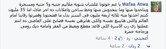– “وفاء عطوة”: “يا عم خوتونا علشان شويه ملاليم جنيه و5 جنيه ومسخرة وبتاخدوا منها وما بتخدوش منها وخط ساخن واعلانات ده أجر عادل إمام 35 مليون كنتم أخذتو منه ثلاثة- أربعة مليون فى الستر بدل ما فضحتونا وقصرتوا رقابنا أمام العالم واللي هايبيع نفسه واللي هايرهن نفسه فضايح على الفاضي”.