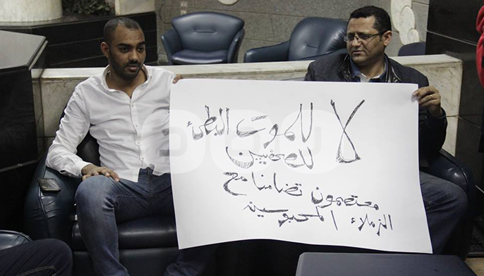 اعتصم كلٌ من محمود كامل وخالد البلشي، عضوا مجلس نقابة الصحفيين، داخل مقر النقابة، منذ الصباح الباكر؛ للتعبير عن رفضهما الكامل لحبس زملائهما الصحفيين، إلى جانب الأوضاع السيئة التي يعاني منها المعتقلون داخل أماكن الاحتجاز، والتي أبرزها حالة الصحفي هاني صلاح الدين، المهدد بفقدان البصر نتيجة الإهمال الطبي داخل السجون.