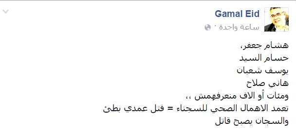وقال -عبر منشور له على “فيس بوك”-: “هشام جعفر، حسام السيد، يوسف شعبان، هاني صلاح.. ومئات أو آلاف منعرفهمش، تعمد الإهمال الصحي للسجناء يساوي قتلًا عمدًا بطيئًا، والسجان يصبح قاتلًا”.