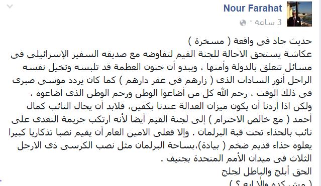 وقال -عبر منشور له على “فيس بوك”-: إن النائب البرلماني “يستحق الإحالة للجنة القيم لتفاوضه مع صديقه السفير الإسرائيلي في مسائل تتعلق بالدولة وأمنها، ويبدو أن جنون العظمة قد تلبسه وتخيل نفسه الراحل أنور السادات الذي (زارهم في عقر دارهم) كما كان يردد موسى صبري في ذلك الوقت: “رحم الله كل من أضاعوا الوطن ورحم الوطن الذي أضاعوه”.