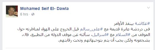 علق الباحث السياسي محمد سيف الدولة، على لقاء النائب توفيق عكاسة بسفير إسرائيل بالقاهرة، بأنه ينفذ الأوامر، وذلك من خلال حسابه الشخصي بموقع التواصل الاجتماعي “فيس بوك” .