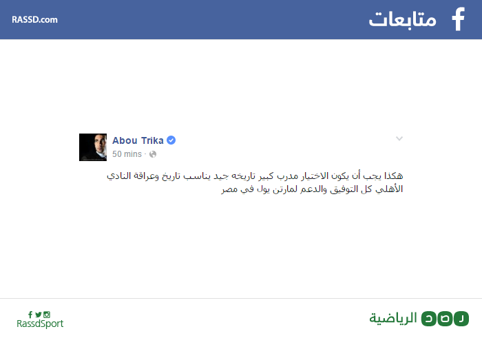 وكتب أبوتريكة في منشور له على صفحته الرسمية عبر موقع التواصل الاجتماعي “فيس بوك”: “هكذا يجب أن يكون الاختيار مدربا كبيرا تاريخه جيد يناسب تاريخ وعراقة النادي الأهلي كل التوفيق والدعم لمارتن يول في مصر”.