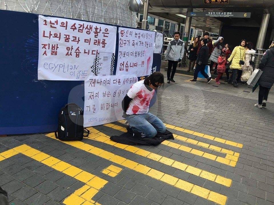 بدأت شهرة محمود متولي سلامة “21 عاما”، عندما قام بعمل وقفة احتجاجية بكوريا الجنوبية، بداية شهر فبراير الماضي، وهو معصوب العينين ومقيد اليدين؛ حيث جلس في أحد الشوارع التجارية بكوريا الجنوبية وعلق خلفه لافتات كتب عليها: “نفسي أعيش بقية حياتي بأمان زي بقية اللي في نفس عمري، مفيش أصعب من إن صاحبك يتقتل قدام عينك، سنة في السجن قتلت كل أحلامي ودمرَت مستقبلي”، وذلك تنديدًا باعتقال وقتل معارضي الحكم العسكري في مصر.