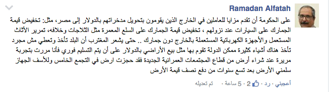 “رمضان الفتاح”: “على الحكومة أن تقدم مزايا للعاملين في الخارج الذين يقومون بتحويل مدخراتهم بالدولار إلى مصر، مثل: تخفيض قيمة الجمارك على السيارات عند نزولهم، تخفيض قيمة الجمارك على السلع المعمرة مثل الثلاجات وخلافه، تمرير الأثاث المستعمل والأجهزة الكهربائية المستعملة بالخارج دون جمارك.. حتى يشعر المغترب أن البلد تأخذ وتعطي مش مجرد تأخذ هناك أشياء كثيرة ممكن الدولة تقوم بها مثل بيع الأراضي بالدولار على أن يتم التسليم فوري فأنا مررت بتجربة مريرة عند شراء أرض من قطاع المجتمعات العمرانية الجديدة فقد حجزت أرض في التجمع الخامس وللأسف الجهاز سلمني الأرض بعد تسع سنوات من دفع نصف قيمة الأرض”.