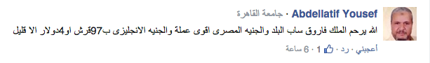 “عبداللطيف يوسف”: “الله يرحم الملك فاروق ساب البلد والجنيه المصري أقوى عملة والجنيه الإنجليزي بـ97 قرشا أو 4 دولارات إلا قليل”.