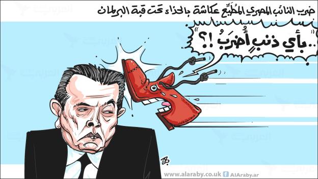 أما عن ضرب النائب توفيق عكاشة بالحذاء في برلمان السيسي فنشر موقع “العربي الجديد” هذا الرسم: