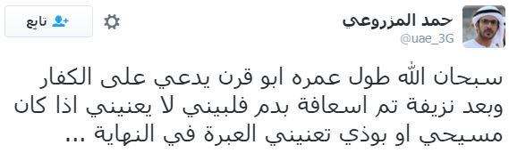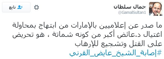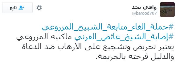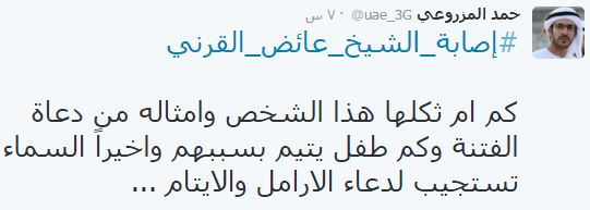 بعد تغريدات الكاتب الاماراتي حمد المزروعي، التي هاجم فيها الدكتور القرني بعد محاولة اغتياله، دشن الرواد العديد من الهاشتاجات ردًا على هجوم المزروعي بحق الداعية السعودية، مثل، “#حمد_المزروعي، #حملة_الغاء_متابعة_الشبيح_المزروعي“، وجاءت كالآتي،
