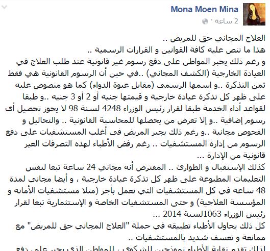 وأضافت “مينا” -عبر منشور لها على “فيس بوك”- “العلاج المجاني حق للمريض ..هذا ما تنص عليه كل القوانين والقرارات الرسمية، ورغم ذلك يجبر المواطن على دفع رسوم غير قانونية عند طلب العلاج في العيادة الخارجية (الكشف المجاني).. في حين أن الرسوم القانونية هي فقط ثمن التذكرة.. واسمها الرسمي (مقابل عبوة الدواء) كما هو منصوص عليه على ظهر كل تذكرة عيادة خارجية وقيمتها جنيه أو 2 أو 3 جنيهات”.
