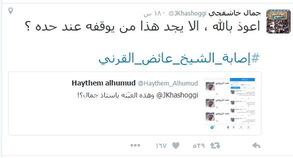 وبرز هاشتاج #إصابة_الشيخ_عائض القرني، بعد دقائق من إصابة الداعية السعودي، والذي حقّق مراكز متقدّمة على “تويتر” في السعودية وظلّ متصدرًا لعدّة ساعات؛ حيث يتابع الداعية السعودي نحو 12 مليون مغرّدٍ على “تويتر”.
