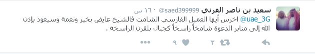 وغرد سعيد بن ناصر القرني قائلًا: “اخرس أيها العميل الفارسي الشامت فالشيخ عايض بخير ونعمة وسيعود بإذن الله إلى منابر الدعوة شامخًا راسخًا كجبال بلقرن الراسخة”.