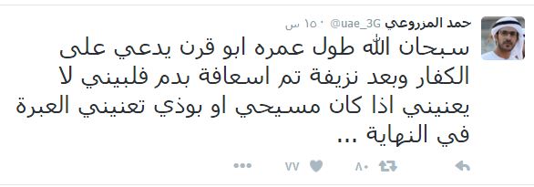 وقال “المزروعي” -في إحدى تغريداته-: “سبحان الله طول عمره أبو قرن يدعي على الكفار، وبعد نزيفه تم إسعافه بدم فلبيني لا يعنيني إذا كان مسيحي أو بوذي تعنيني العبرة في النهاية”.