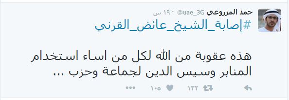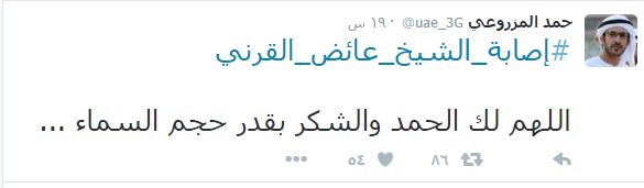 أثارت عدة تغريدات للكاتب الإماراتي حمد المزروعي، غضب العديد من السعوديين، ما أدى إلى نشوب حرب تغريدات على “تويتر”؛ وذلك على خلفية إصابة الشيخ السعودي عائض القرني جراء حادث إطلاق نار في الفلبين، أمس الثلاثاء.
