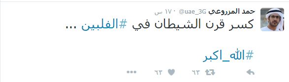 وأضاف -في تغريدة أخرى-: “كسر قرن الشيطان في الفلبين، الله أكبر”، وغرد قائلًا: “هذه عقوبة من الله لكل من أساء استخدام المنابر وسيس الدين لجماعة وحزب…”.