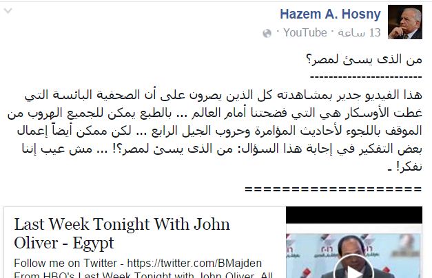 حازم حسني عارضًا فيديو “أوليفر” الساخر من السيسي: من الذي يسيء لمصر؟