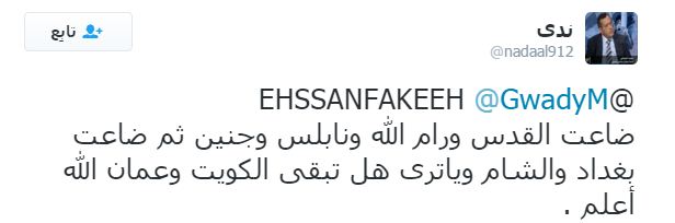 ندى: ضاعت القدس ورام الله ونابلس وجنين ثم ضاعت بغداد والشام ويا ترى هل تبقى الكويت وعمان؟! الله أعلم.