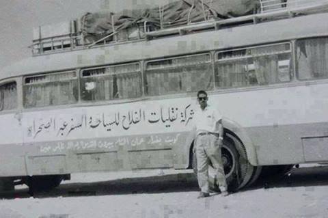 وتظهر الصورة “باص” قديما، يحمل اسم شركة نقليات الفلاح للسياحة والسفر عبر الصحراء، وكتب عليه: “الكويت- بغداد- عمان- دمشق- بيروت- القدس- رام الله- نابلس- جنين ..“.
