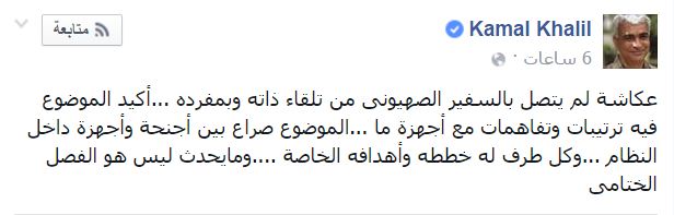 وأضاف -في منشور له عبر صفحته الشخصية بموقع التواصل الاجتماعي “فيس بوك”- “عكاشة لم يتصل بالسفير الصهيوني من تلقاء ذاته وبمفرده… أكيد الموضوع فيه ترتيبات وتفاهمات مع أجهزة ما”، مضيفًا “الموضوع صراع بين أجنحة وأجهزة داخل النظام.. وكل طرف له خططه وأهدافه الخاصة، وما يحدث ليس هو الفصل الختامي”.