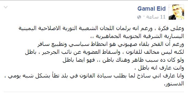 وأضاف “عيد”، “وإسقاط العضوية عن نائب الجرجير، باطل، ولو كان ده سبب ظاهر وهناك باطن، فهو أيضًا باطل، وانت عارف إنه باطل، وأنا عارف إني ساذج لما بطلب سيادة القانون في بلد تطأ بشكل شبه يومي، الدستور”.