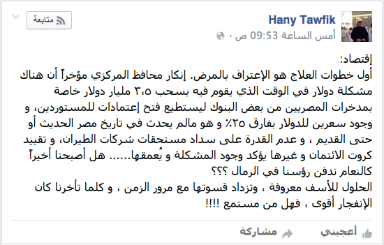 وانتقد الخبير المالي في منشور على صفحته الشخصيةعبر” فيس بوك” إنكار محافظ المركزي مؤخرا وجود مشكلة في توفير العملة الصعبة، مشددا: “أول خطوات العلاج هو الاعتراف بالمرض”.