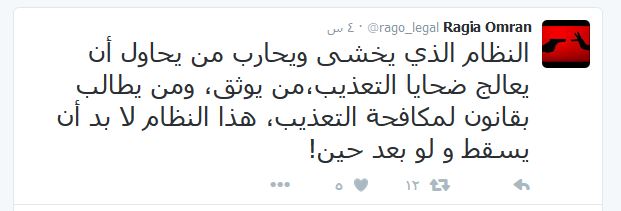 وأكدت راجية -في تغريدتها- أن النظام الذي يحارب من يحاول علاج ضحايا التعذيب، أو مجرد توثيق حالات التعذيب، أو من يطالب بقانون لمكافحة التعذيب، لا بد أن يسقط ولو بعد حين.