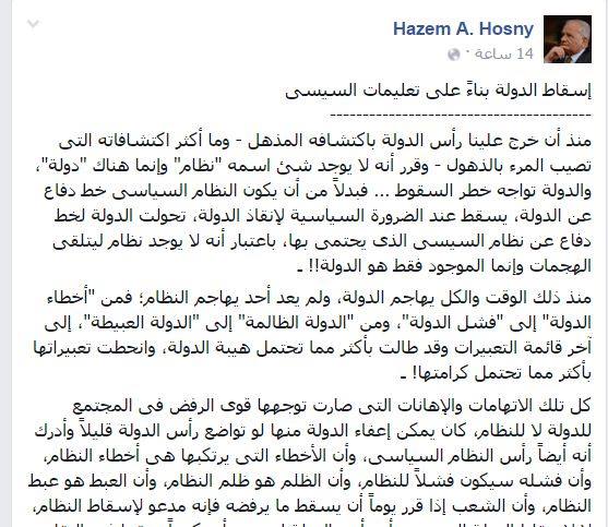 واختتم “حسني”: يجب أن نتفهم خطورة استقرار هذا المعنى السلبي في نفوس العامة، وأن يخرج العوام في يوم من الأيام ليهتف “الشعب يريد إسقاط الدولة”!!… فليلعب رأس الدولة لعبة الشيطان هذه -عن جهل أو عن خبث- كما يشاء، لكن من العار أن نجاريه فيها، فلا نعرف كيف نميز بين مفهوم “الدولة” ومفهوم “النظام”.
