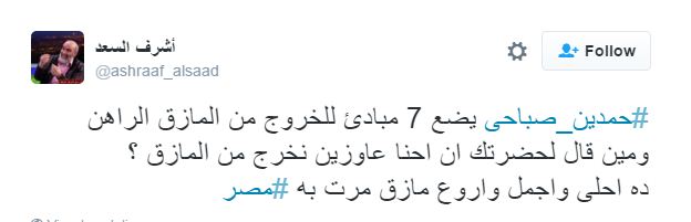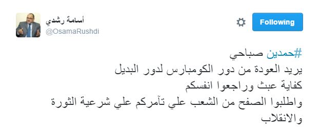 أسامة رشدي، عضو المجلس الثوري المستقيل: “حمدين صباحي يريد العودة من دور الكومبارس لدور البديل، كفاية عبث وراجعوا أنفسكم، واطلبوا الصفح من الشعب على تآمركم على شرعية الثورة والانقلاب”.