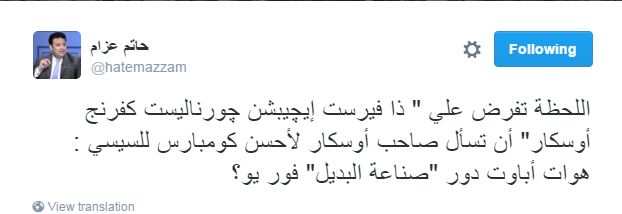 حاتم عزام، البرلماني السابق: “اللحظة تفرض علي “ذا فيرست إيچيبشن چورناليست كفرنج أوسكار” أن تسأل صاحب أوسكار لأحسن كومبارس للسيسي : هوات أباوت دور “صناعة البديل” فور يو؟”.