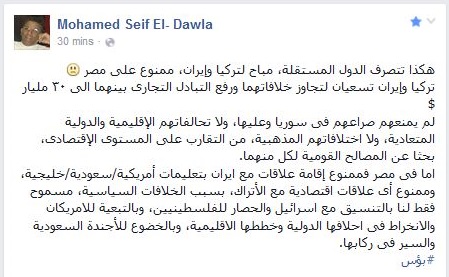 وقال “سيف الدولة” في تعليقه: “إن مصر ممنوعة من إقامة علاقات خارجية، بتعليمات دولية، وغير مسموح لها إلا بالتنسيق مع إسرائيل وحصار الفلسطينيين”.