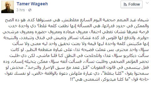 واستنكر وجيه في منشور له عبر حسابه على موقع التواصل الاجتماعي “فيس بوك” من سوء تغطية الصحفية شيماء عبدالمنعم لمهرجان توزيع جوائز الأوسكار.