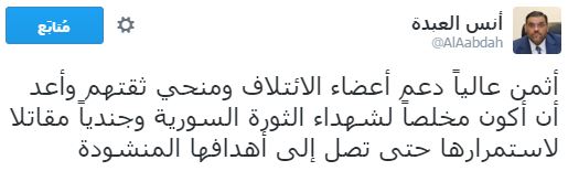 (8) كتب العبدة عقِب انتخابه رئيسًا للائتلاف، على حسابه الرسمي على موقع التواصل الاجتماعي “تويتر” قائلًا:”أثمن عاليًا دعم أعضاء الائتلاف ومنحي ثقتهم، وأعد أن أكون مخلصًا لشهداء الثورة السورية، وجنديًا مقاتلاً لاستمرارها حتى تصل إلى أهدافها المشودة”.
