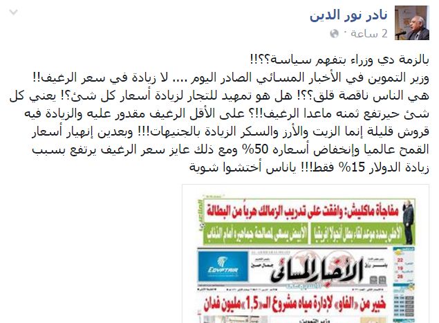 وأضاف “على الأقل الرغيف مقدور عليه والزيادة فيه قروش قليلة، إنما الزيت والأرز والسكر الزيادة بالجنيهات!!! وبعدين انهيار أسعار القمح عالميًا وانخفاض أسعاره 50% ومع ذلك عايز سعر الرغيف يرتفع بسبب زيادة الدولار 15% فقط!!! يا ناس اختشوا شوية”.