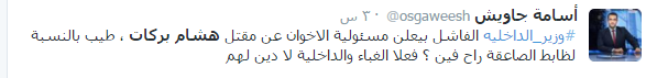 وقال في تغريدة عبر حسابه على موقع التواصل الاجتماعي “تويتر”: “وزير الداخلية الفاشل بيعلن مسؤولية الإخوان عن مقتل هشام بركات، طيب بالنسبة لضابط الصاعقة راح فين؟ فعلاً الغباء”.