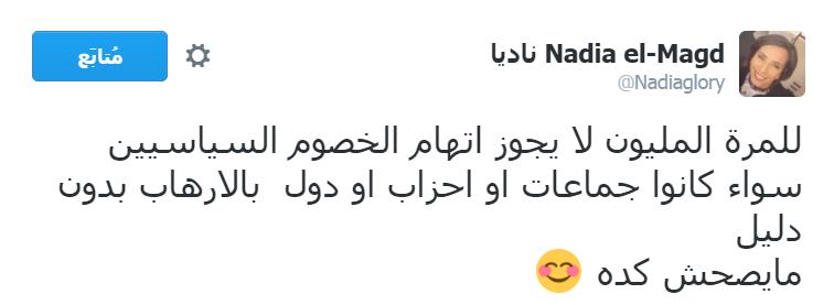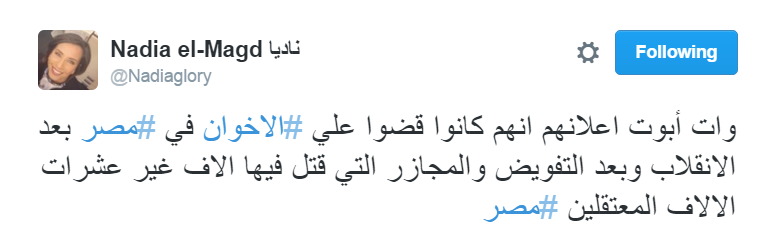 أما الإعلامية نادية أبوالمجد، فأطلقت سلسلة من التغريدات على حسابها الشخصي، بموقع التدوين المصغر “تويتر”، استنكرت خلالها إعلان وزير الداخلية اللواء مجدي عبدالغفار مسؤولية جماعة الإخوان عن اغتيال النائب العام السابق هشام بركات.