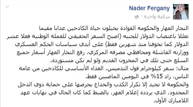 هاجم الدكتور نادر فرجاني، أستاذ العلوم السياسية بجامعة القاهرة، التجار والحكومة؛ نتيجة ما يفعلونه بالمواطنين من رفع أسعار السلع الأساسية.