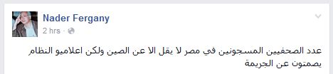 وقال “فرجاني” في تعليقه: “إن عدد الصحفيين المسجونين يقترب من مضاهاة عدد أمثالهم في الصين، وهم كثر، إلا أن إعلام السيسي يصمت عن تلك الجريمة فلا يعلم المصريون عنها شيئا”.