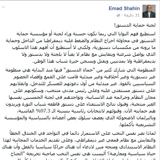 اعتبر الدكتور عماد شاهين، الباحث في الإسلام السياسي في جامعة هارفارد ونوتردام، أن إنشاء مؤسسة لحماية الدستور، هو شرعنة لنظام لا يعبأ بديمقراطية ولا دستور، ويستمر في انتهاك الحريات.
