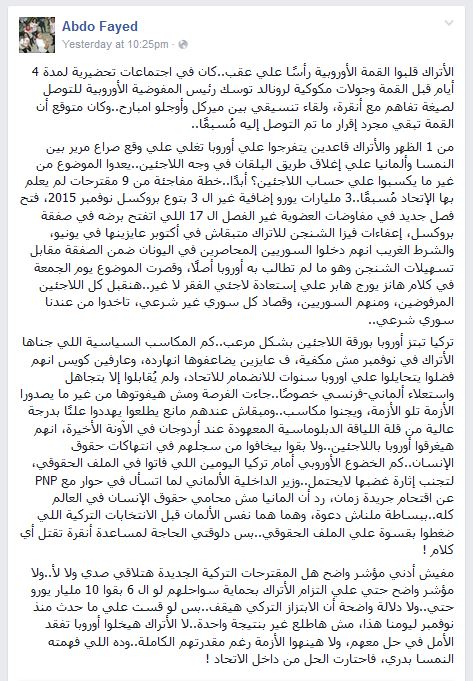 وأوضح فايد في تعليقه، أن الأتراك قلبوا القمة الأوروبية رأسا على عقب، بمباغتتهم الاتحاد الأوروبي بخطة مفاجئة مكونة من 9 مقترحات لم يعلم بها الاتحاد مسبقا، شملت عدة مطالب وامتيازات للصالح التركي.