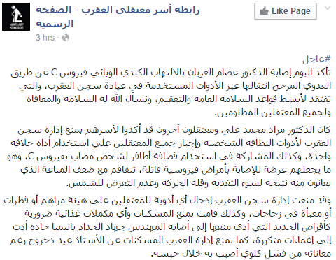 واستشهدت الصفحة بتصريح نُسب إلى المتحدث الإعلامي باسم حزب الحرية والعدالة الدكتور مراد علي، المسجون داخل سجن العقرب، أشار فيه إلى حجب إدارة السجن أدوات النظافة الشخصية عن المعتقلين، وإجبار جميع المعتقلين على استخدام أداة حلاقة واحدة، وقصافة أظافر لشخص مصاب بفيروس C.