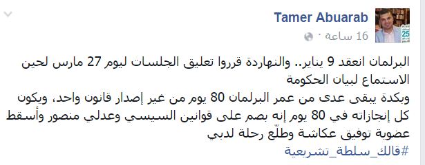 قال الكاتب الصحفي تامر أبوعرب: مر 80 يوما من عمر مجلس النواب، لم يصدر فيها أي قوانين غير إقرار القوانين التي أصدرها عبدالفتاح السيسي وعدلي منصور.