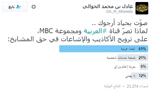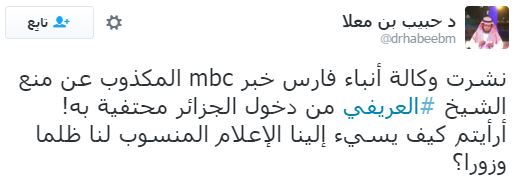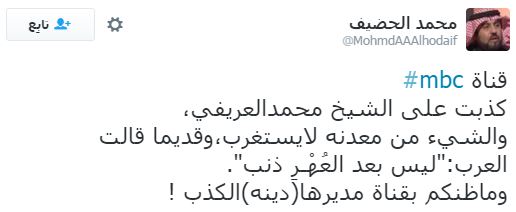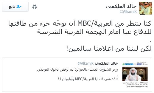 وأبدى العريفي عدم استغرابه مما نشرته القناتان السابقتان، وقال: “ما افترته الـ”mbc” لم أستغربه هذا يضاف لجهدهم الأسود في تشويه صورة الدعاة والعلماء، وأهل الجزائر أهل علم ولي أصدقاء كثر هناك أستفيد منهم”، ونشر العريفي تغريدة، وقال: “نشرت قناتا العبرية و”mbc” أن العريفي وصل الجزائر لإلقاء محاضرات فمُنع من دخولها! هذا كذبٌ يُضاف لسجلهم الأسود لم أسافر للجزائر إلا قبل 10 سنين!”.