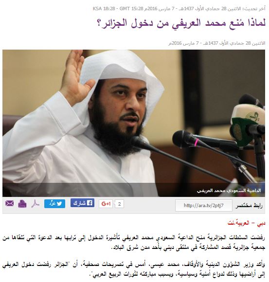 نشر موقع “العربية نت” خبرًا قبل يومين تحت عنوان “لماذا مُنع محمد العريفي من دخول الجزائر؟”، وأشارت التفاصيل إلى أن السلطات الجزائرية رفضت منح الداعية السعودي محمد العريفي تأشيرة الدخول إلى أراضيها بعد الدعوة التي تلقاها من جمعية جزائرية قصد المشاركة في ملتقى ديني بإحدى مدن شرق البلاد.