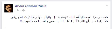 وقال يوسف في منشور له عبر صفحته الرسمية بموقع التواصل الاجتماعي “فيس بوك”: “باسمي وباسم سائر أنصار المقاومة ضد إسرائيل نهنئ الكيان الصهيوني باختيار السيد أبوالغيط أمينا عاما لما يسمى جامعة الدول العربية”، وذلك في إشارة منه إلى أن أبوالغيط سيكون خير عون للصهيونية ضد مصالح العرب.